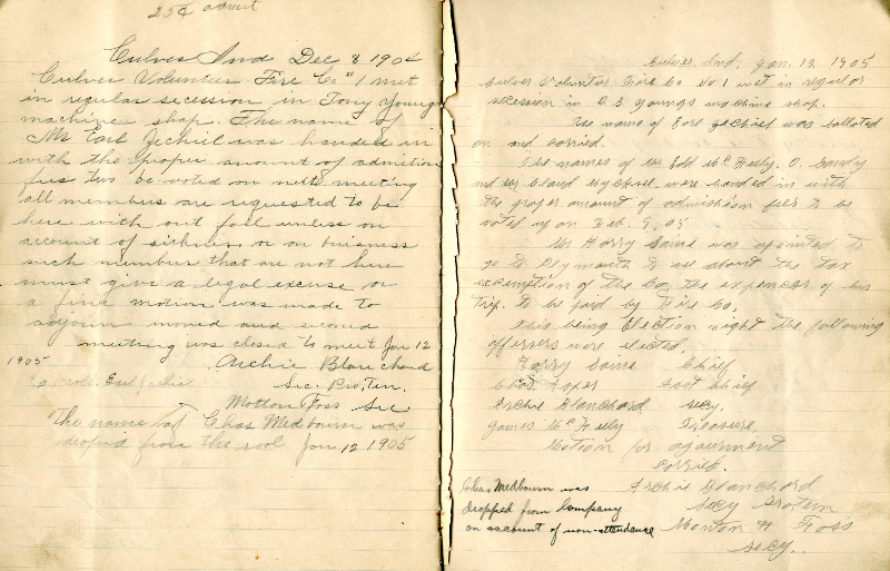 The Culver Fire Department, which formed in Jan., 1903, began keeping hand-written records which continued through  the century. Pictured here is the very first book in its entirety. Read more about the formation of the department and its early minutes here.